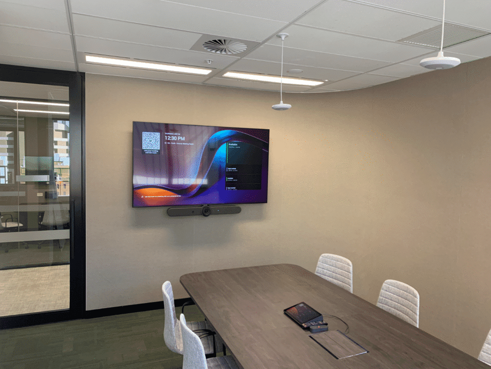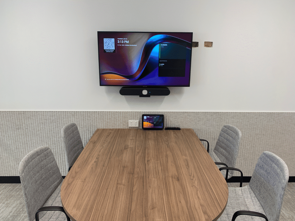 For the 8-person meeting room, we supplied a 75-inch Samsung commercial display and Logitech Rally Bar, again paired with a table-mounted TAP IP touch controller and two pendant microphones. A TAP Scheduler booking panel was also fitted at the entrance.