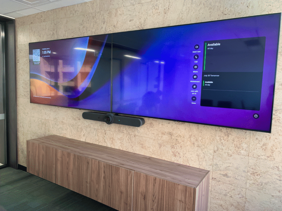 The smaller 4-person meeting rooms were equipped with smaller sized Samsung commercial displays, Logitech Rally Bar Huddle systems, TAP IP Meeting controllers, and TAP Scheduler panels to keep booking and operation consistent with all spaces.