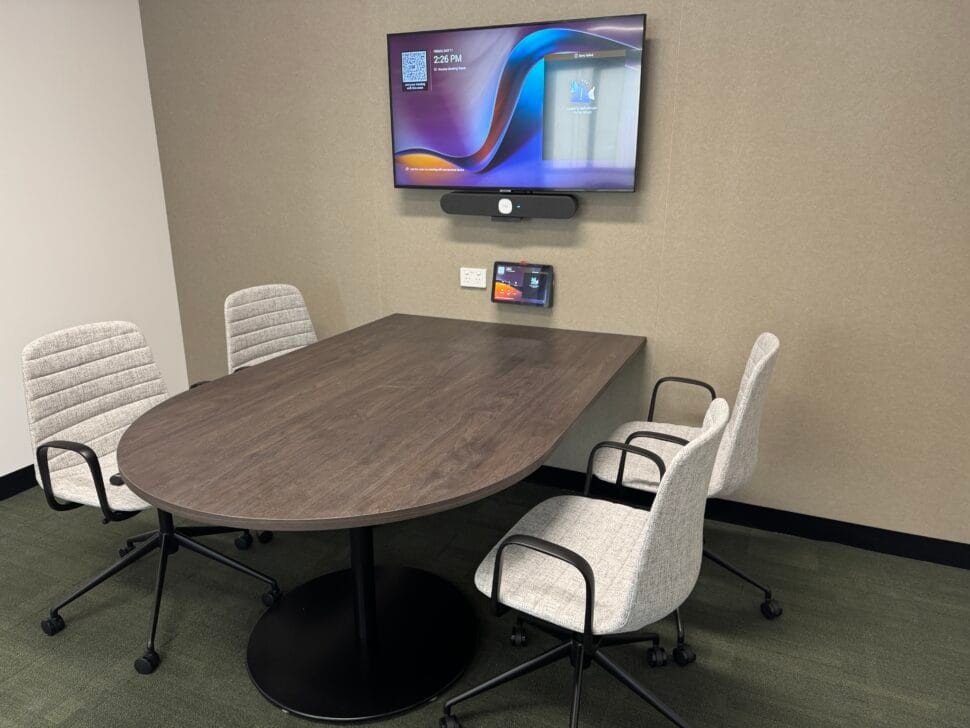Every space was set up with a Microsoft Teams Room VC System on Android, complete with wall or table-mounted TAP controllers and room booking panels so staff can simply book a meeting, walk in, and press start. The large boardroom and meeting rooms are also equipped with content ingest for ease of sharing directly to the room displays.